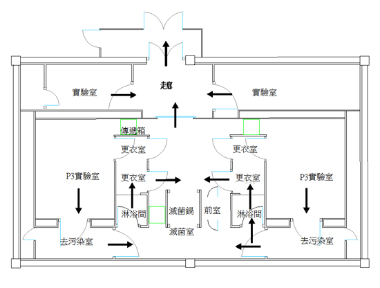 a)實驗室核心區域由安放有CLASS Ⅱ級生物安全櫃的房間(主實驗室)和進入通道組成。進入通道包括更衣區和消毒區。更衣區依次為外更衣室、淋浴室和內更衣室,消毒區為化學淋浴室,工作人員離開主實驗室時首先經過化學淋浴消毒正壓防護服表面。核心區任何相鄰的門之間都有自動連鎖裝置,防止兩個相鄰的門被同時打開。對於不能從更衣室攜帶進出主實驗室的材料、物品和器材,應在主實驗室牆上設置具有雙門結構的高壓滅菌鍋、浸泡消毒槽、薰蒸室或帶有消毒裝置的通風傳遞窗,以便進行傳遞或消毒。必須設置帶氣閘室的緊急出口通道。